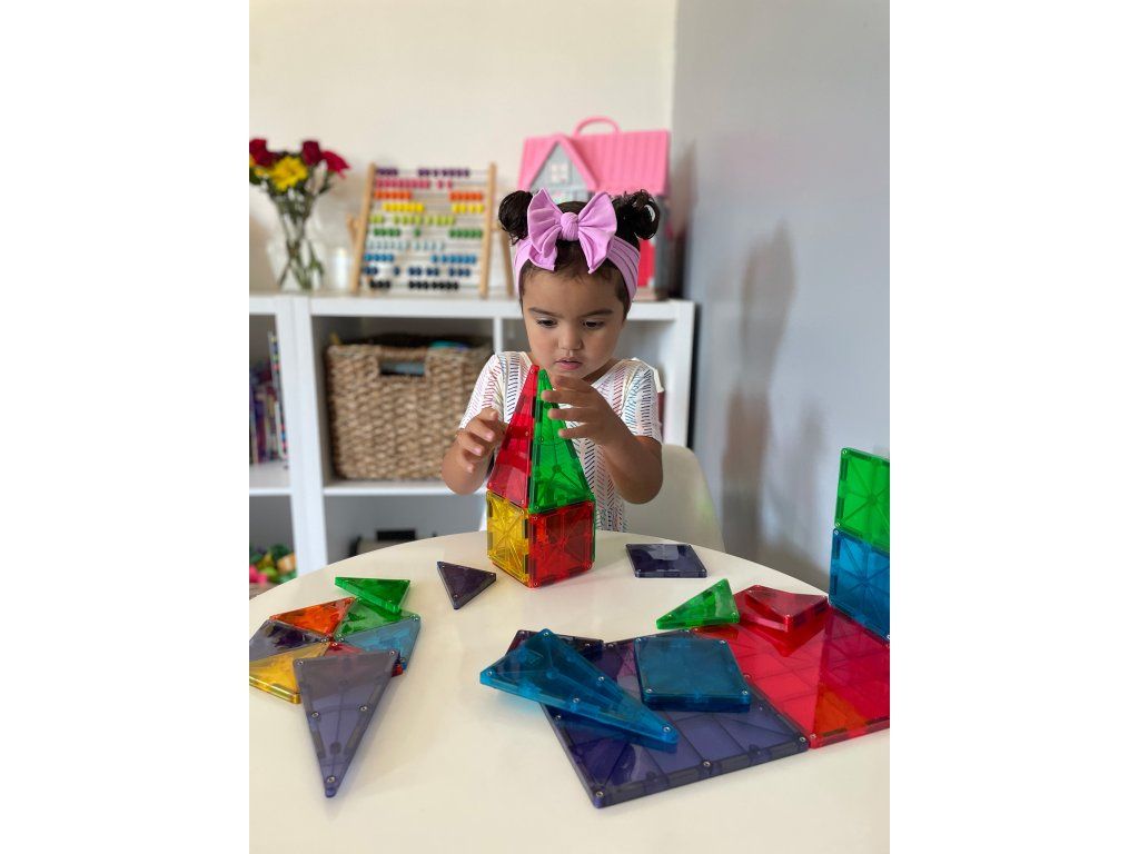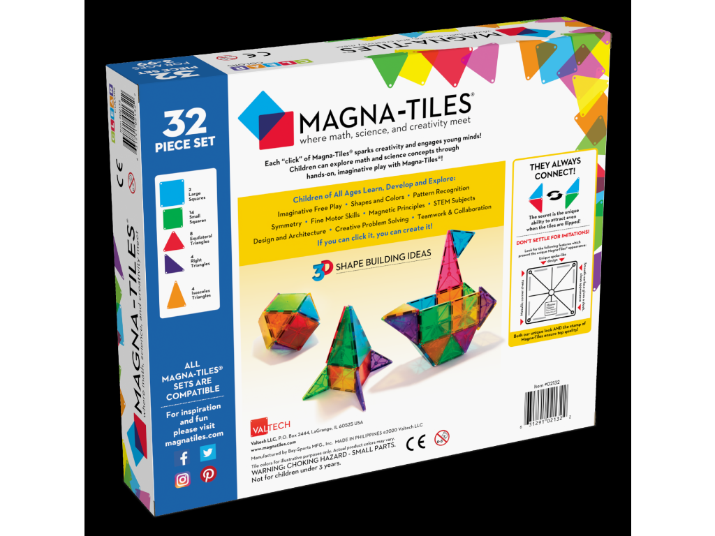S originální magnetickou stavebnicí MAGNA-TILES® mohou děti klikat, spojovat, skládat a třídit klasické geometrické tvary v jasných, živých barvách a užít si hodiny zábavy. Sada obsahuje 32 čtverců a trojúhelníků různých velikostí, aby si děti mohly postavit vše, o čem sní. Stavebnice je kompatibilní se všemi soupravami Magna-Tiles®, což umožňuje nekonečné možnosti kombinací.