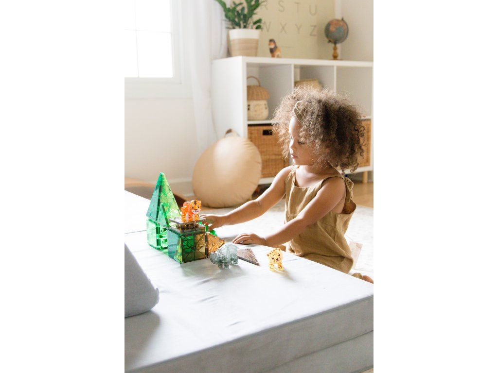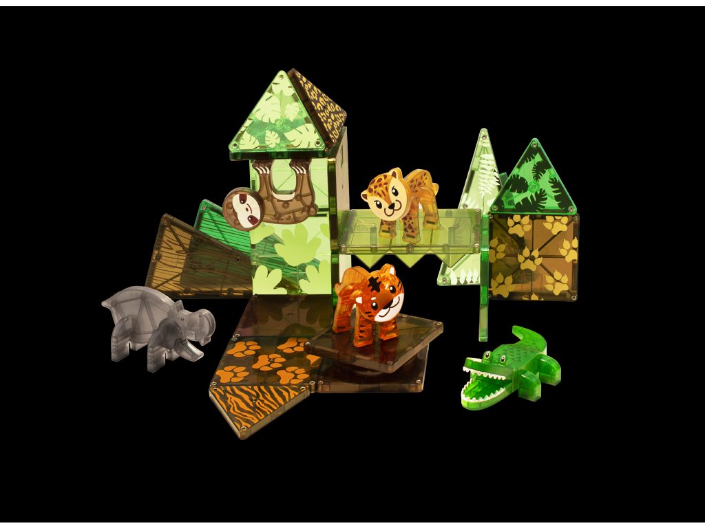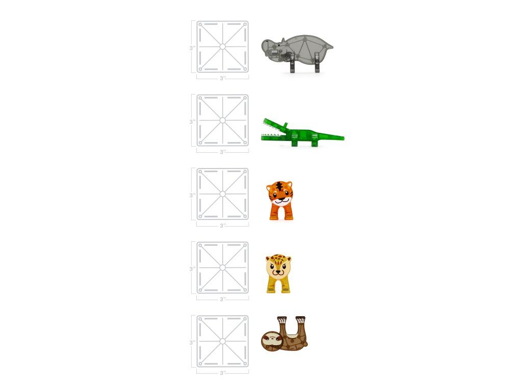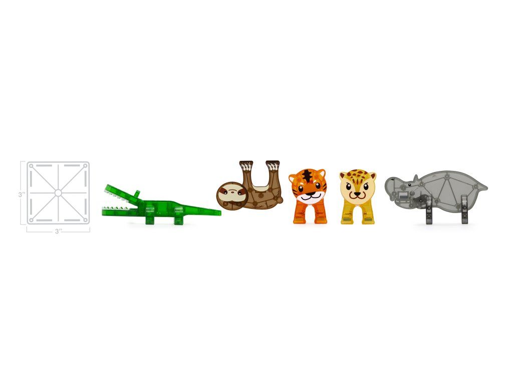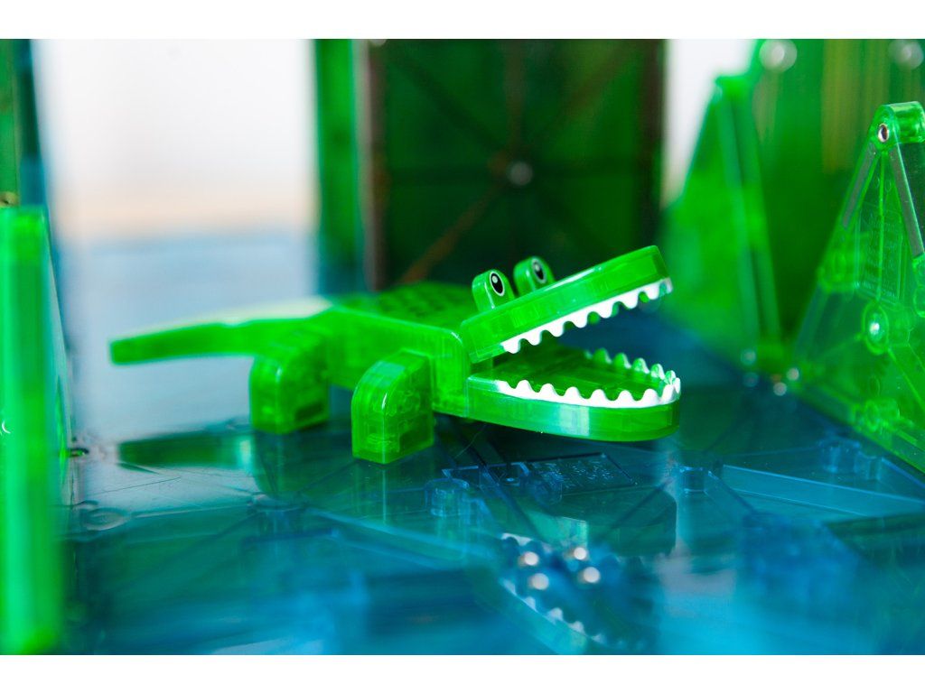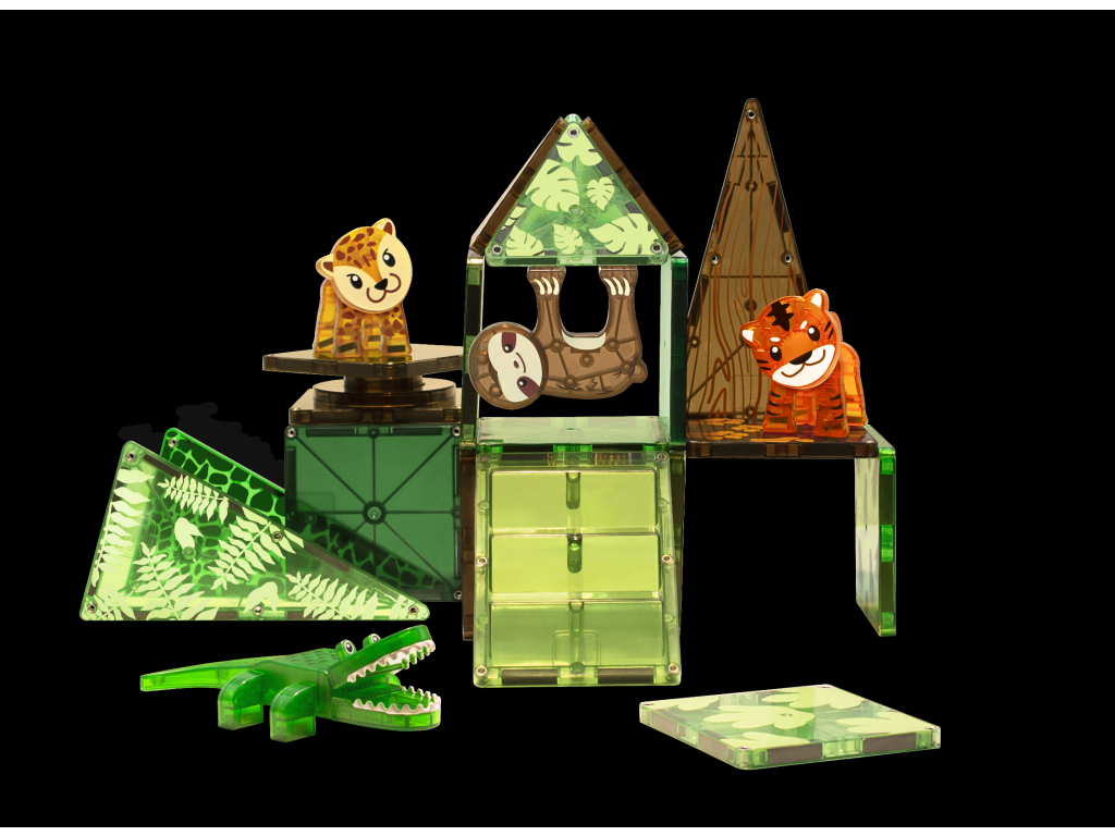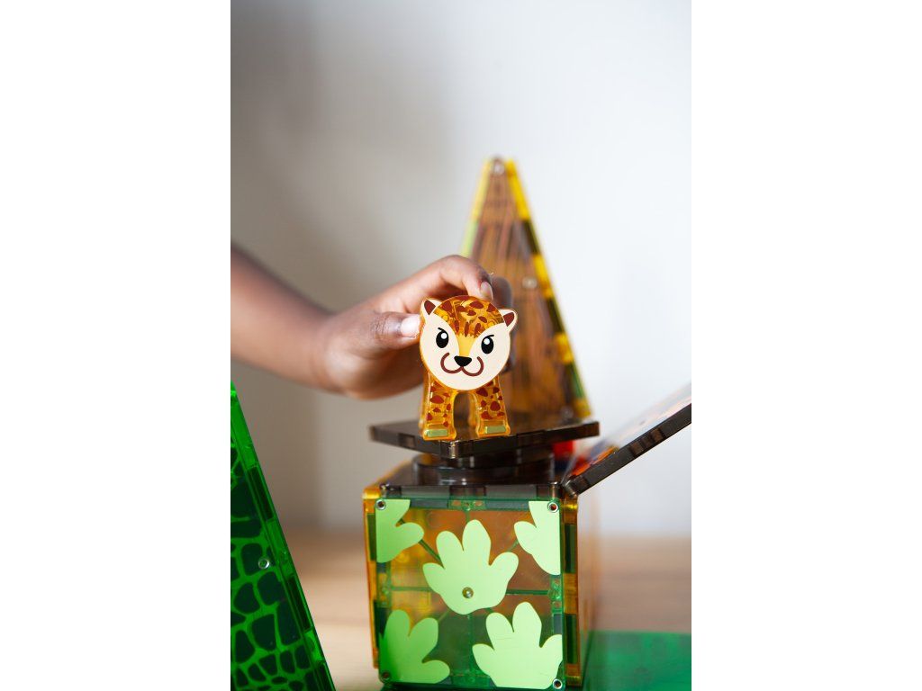 Úžasná magnetická stavebnice MAGNA-TILES® Jungle přináší hodiny nápadité a soustředěné zábavy. Obsahuje pět magnetických zvířátek z džungle (hroch, lenochod, tygr, leopard a aligátor) s pohyblivými částmi, které jsou připravené prozkoumávat divoký prales. Děti se navíc naučí fakta o zvířatech, která v tomto záhadném světě žijí. Všechny díly jsou plně kompatibilní a doplňují se se všemi ostatními soupravami MAGNA-TILES.