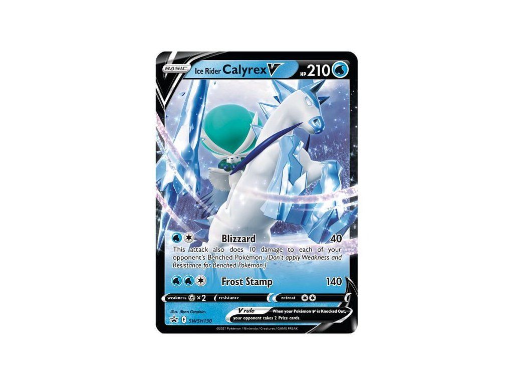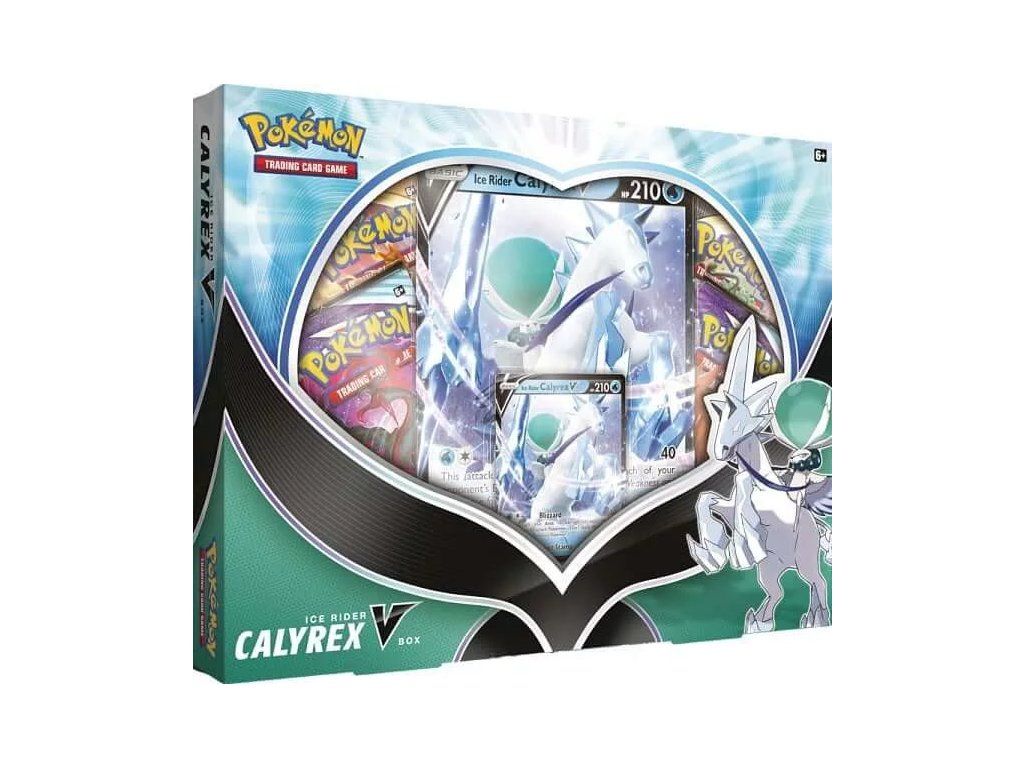 Pokémon Ice Rider Calyrex V Box je speciální dárkový produkt karetní hry Pokémon, který umožňuje hráčům snadno získat kartu silného Pokémona Ice Rider Calyrex V. V balení se nachází jedna speciální foilová Promo karta a obří sběratelská Jumbo karta Pokémona Ice Rider Calyrex V. Karta Pokémona V je pro tento produkt upravena a vyšla speciálně s jiným obrázkem než v klasické sadě. Součástí obsahu jsou také 4 doplňkové Booster balíčky a kód do online hry. Pokémon Ice Rider Calyrex V je karta, která se hodí do všech Vodních balíčků.