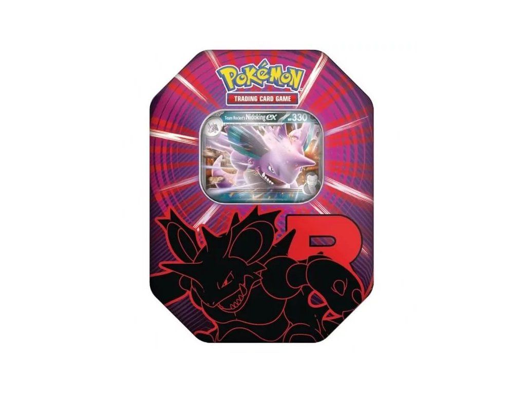 Jedná se o plechovku standardní velikosti, ve které najdete čtyři balíčky Pokémon karet a jednu foilovou promo kartu Team Rocket's Nidoking ex (SVP 217).