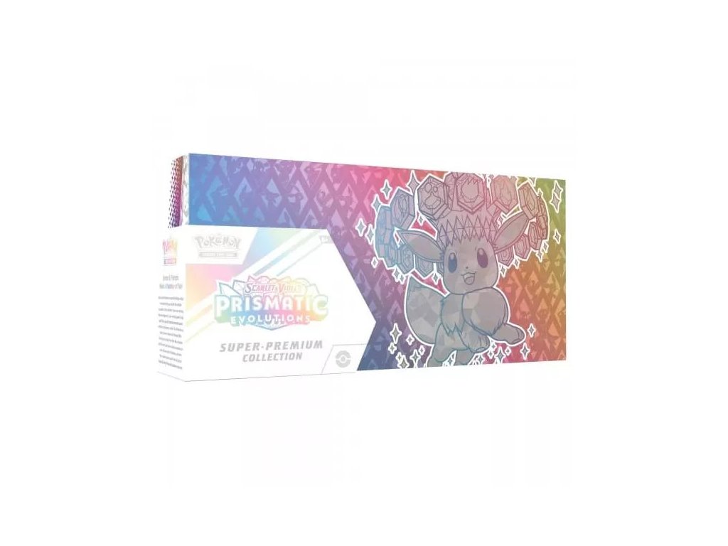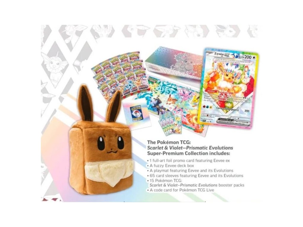 Pokémon Prismatic Evolutions Eevee Super Premium Collection je balení 15 balíčků, plyšové Eevee krabičky, podložky, obalů a promo karty Eevee. Půjde o velice žádanou kolekci.