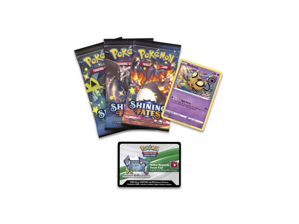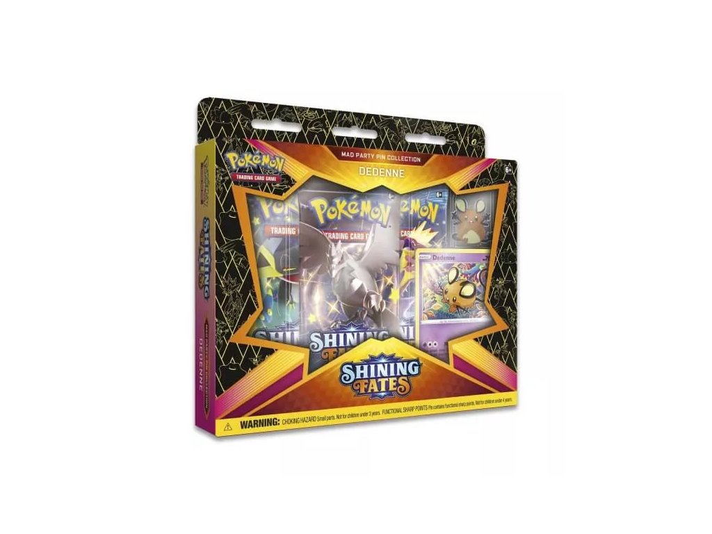 Pokémon Shining Fates Mad Party Collection Dedenne je speciální odznáčkový produkt, ve kterém naleznete foilovou promo kartu s Pokémonem Dedenne, který ovládá kombo útok Mad Party, 3 doplňkové booster balíčky ze speciálního setu Shining Fates a krásný připínací odznáček vybraného Mad Party Pokémona. Rozšiřte si vaši sbírku karet z edice Shining Fates a pokud budete mít štěstí, narazíte při rozbalování také na vzácné Shiny Pokémony oblasti Galar. Nádherný Shiny Charizard VMAX se ukrývá právě v Shining Fates.